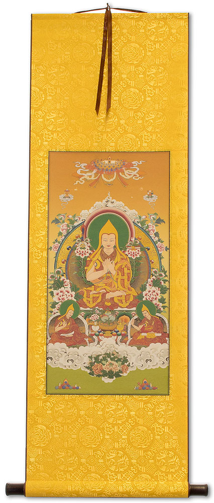 This wall scroll is designed to have a classic look (like an antique). This one is on a yellow silk brocade that is associated with Buddhism and Emperors.